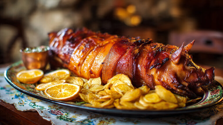 Leitão à Bairrada is a traditional dish from the Bairrada region, known for its roasted suckling pig. The pig is marinated with a mixture of garlic, salt, and pepper, then slow-roasted until the skin is crispy and the meat is tender and juicy. Served with sides like potatoes, salad, and orange slices, this dish is a festive and flavorful experience.