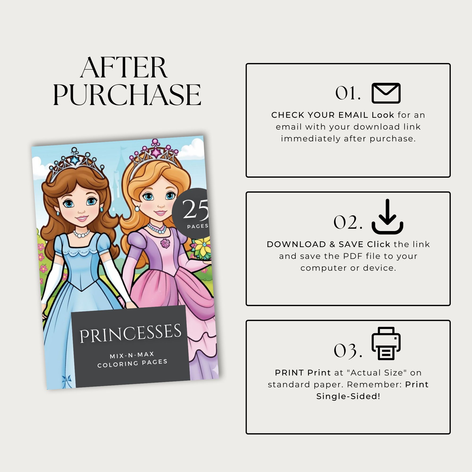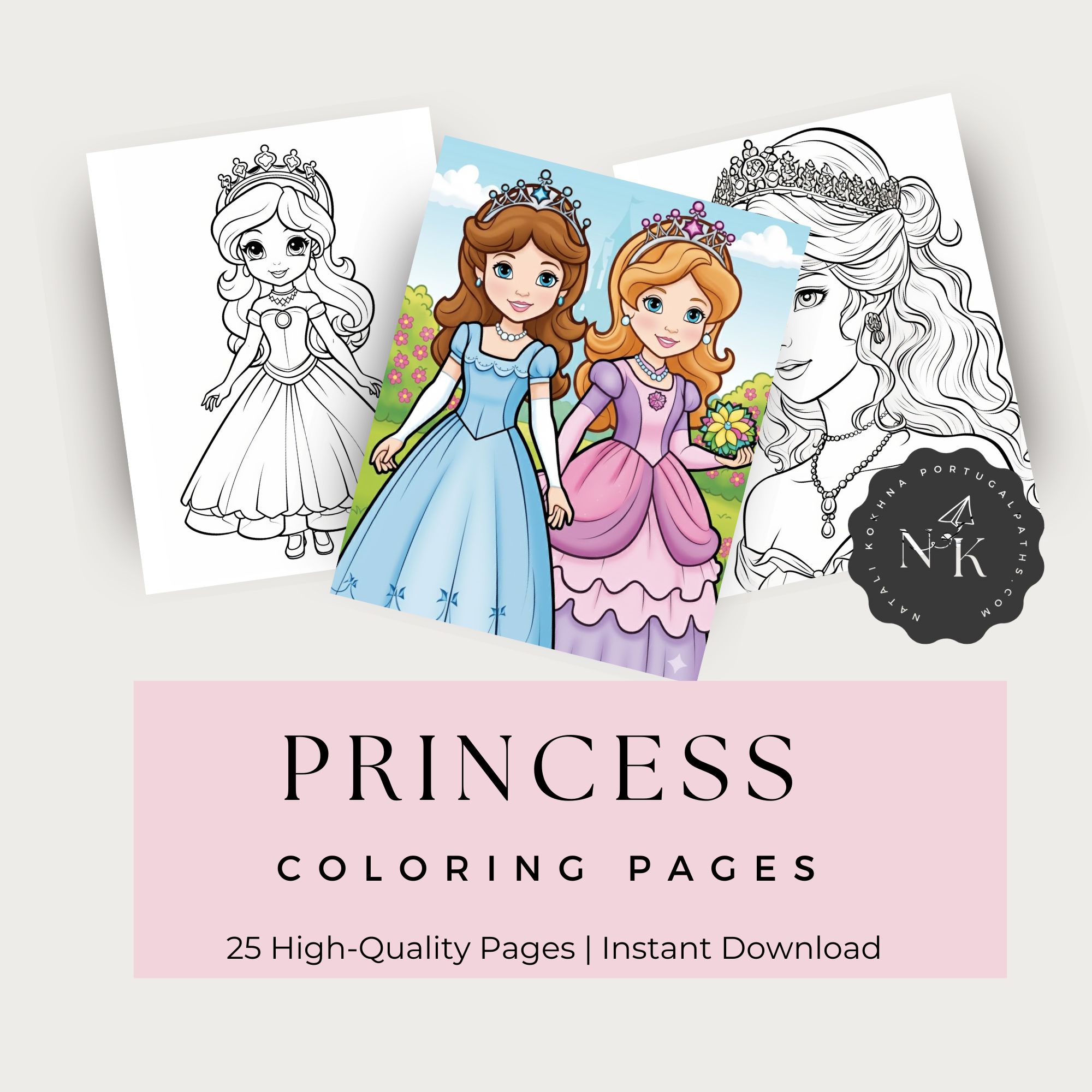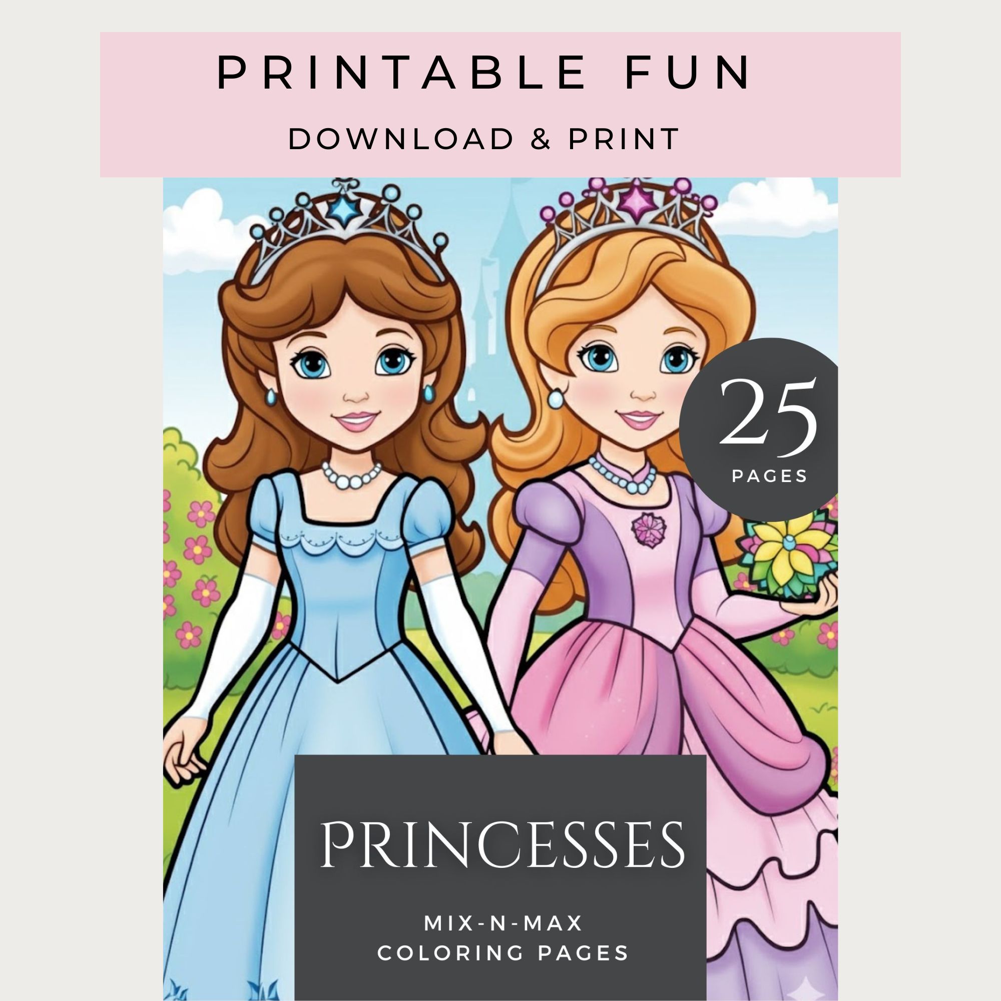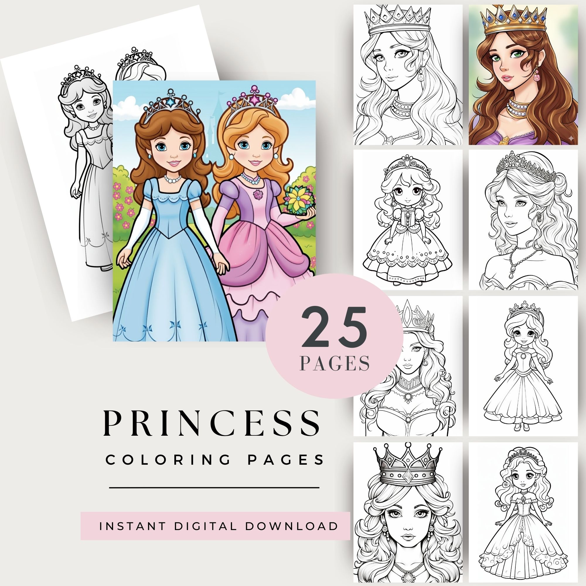 Bring the magic home! This digital coloring book features 25 unique, high-quality pages with beautiful princesses, ready for a splash of color. Perfect for ages 4-8. Instant PDF download.