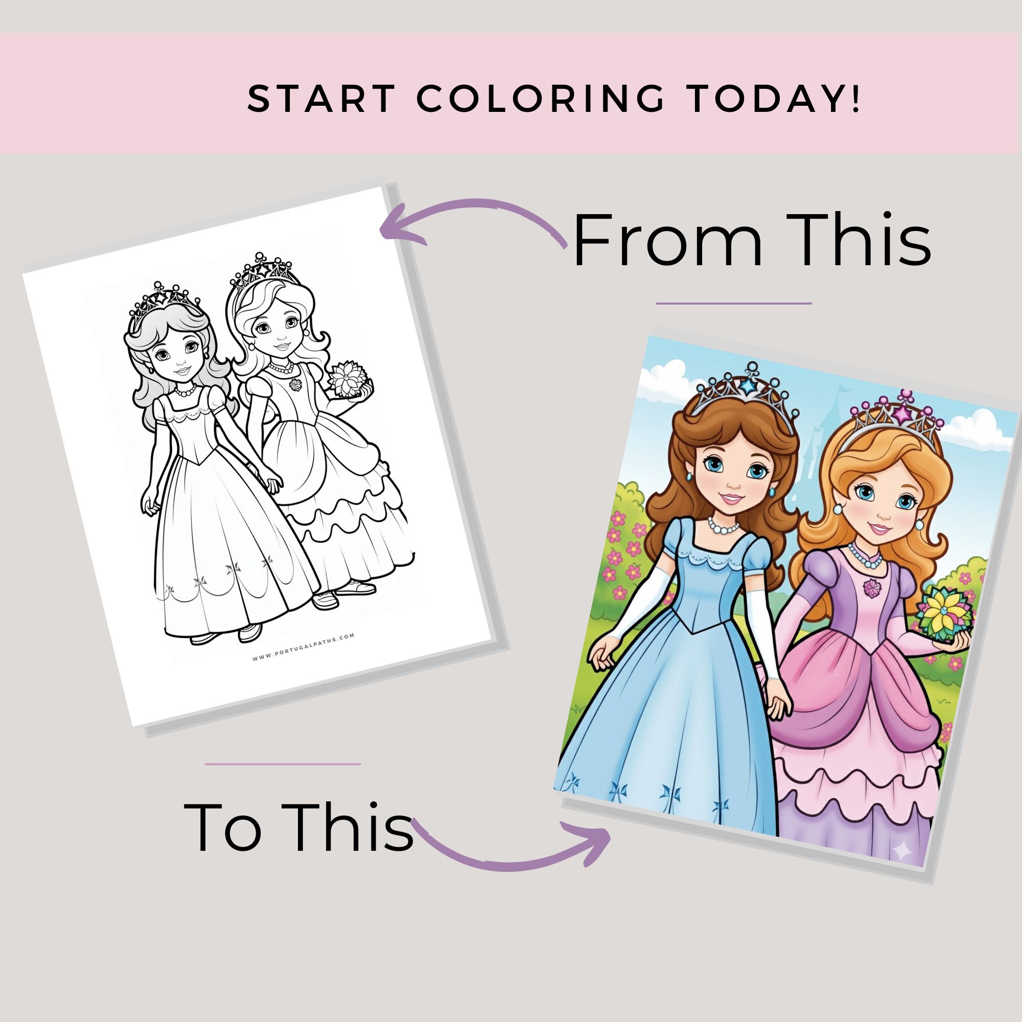 25 Unique Pages: A wide variety of princess scenes, including detailed gowns, royal accessories, and magical backdrops.