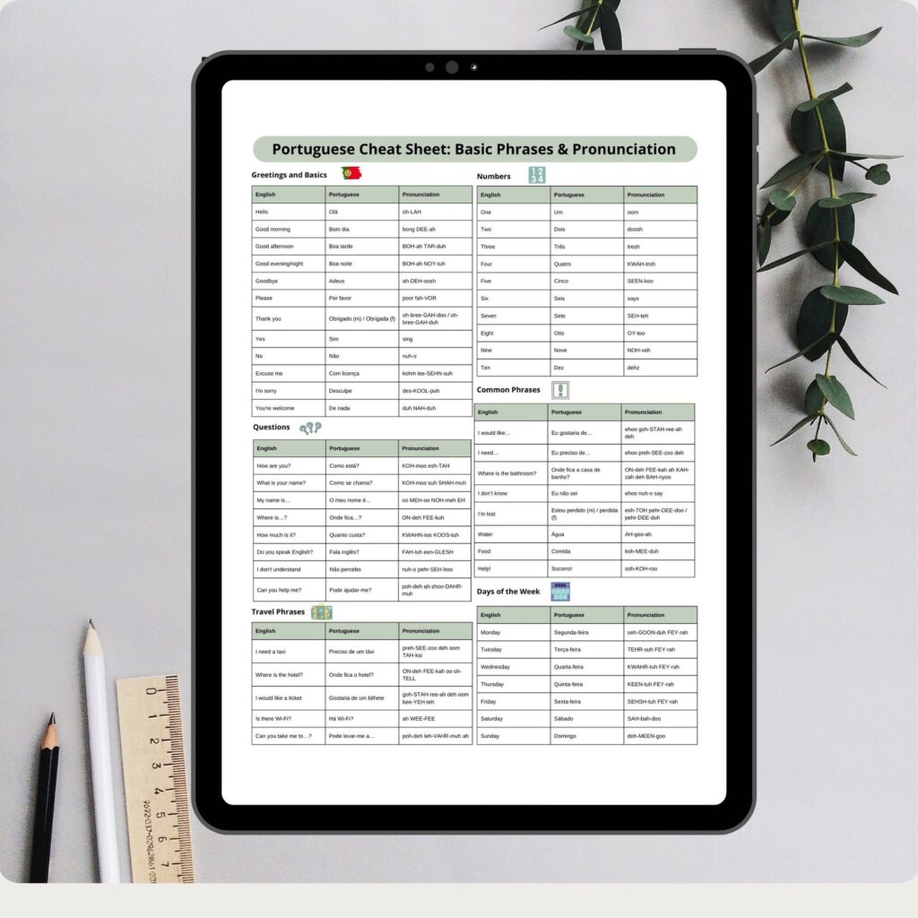 Get started with essential European Portuguese phrases in seconds! This free cheat sheet includes basic greetings, common questions, travel phrases, and easy-to-follow pronunciations—perfect for travelers, beginners, and anyone wanting to communicate confidently in Portuguese.